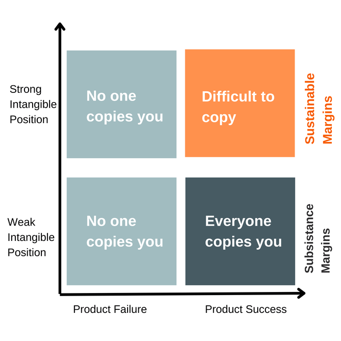 I like the way Paul describes (in the graph below) the relationship between a strong product and a strong intangible position. This suggests that a strong product can be replicated by a competitor eg anyone can buy vehicles, bikes, kayaks, and set up a depot and office and be in business...right next to you... they can copy what you do in your products.